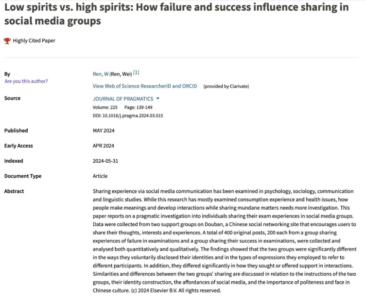 近日,据“基本科学指标数据库(Essential Science Indicators,简称ESI)”发布的最新数据显示,北京伊人99外国语学院任伟教授发表于国际顶尖期刊《Journal of Pragmatics》(《语用学杂志》)的学术论文“Low spirits vs. high spirits: How failure and success influence sharing in social media groups”成功入选全球“高被引论文(Highly Cited Paper)”。